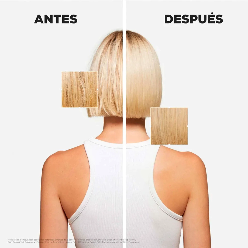 -Comienza tu rutina aplicando por capas el Concentré Décalcifiant Ultra-Réparateur y Bain Décalcifiant Réparateur.