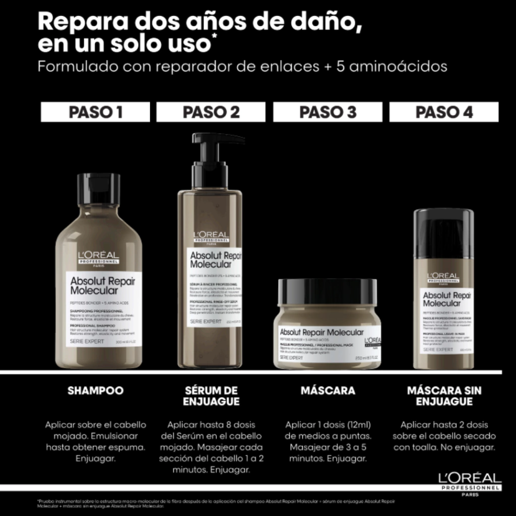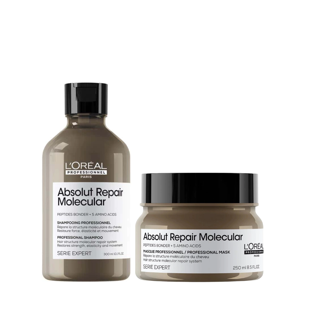 ¿Quée hace? El Kit Loreal Serie Expert Absolut Repair Molecular está diseñado para ofrecer una solución integral a los problemas de cabello dañado. Este conjunto incluye el Shampoo Absolut Repair Molecular 300ml y la Máscara Absolut Repair Molecular 250ml, formulados con un innovador Reparador de enlaces y 5 Aminoácidos. Juntos, reparan la macromolécula del cabello, proporcionando resultados visibles y duraderos.